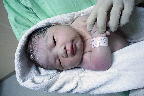 伴著疼痛我看著移動的日光燈移動到了產房,也看到傳說中的產台,不過不像網路上說的護士很不人道,凶狠的要你自行爬過去,只是協助你橫著移動到產台。接著護士還是叫我自己繼續用力,一邊用手幫我撥開產道口,幾分鐘過去她們陸續準備,不到一會只聽到一名護士打電話叫醫生上來接生,等醫生的時間我差點睡著因為很累又用力過度,不過只停頓了十幾秒我馬上又被痛感所刺激驚醒過來,又像個笨蛋繼續在產台上用力。實在是又累又痛等醫生帶著小胖一進產房,我的記憶已經呈現模糊狀態,隱約只知道還有一名醫生站在我肚子上方準備幫我推肚子,接著配合護士的口號用力,用力了4次甜甜就出來了,那一瞬間覺得好像有什麼東西滑出來,一開始沒聽到甜甜的哭聲我有點緊張把頭仰起來拼命望著護士手上那個小小青青的東西,後來聽到一陣小小的哭聲我感動的流下淚來,一旁幫我擦汗和眼淚的小胖還以為我怎麼了,她怎會了解我當媽媽的心情汗感動呢!這中間醫生已經動手幫我推肚子以利胎盤的產出,突然覺得有什麼濕濕的東西流出來,很像大量經血排出的感覺,接著醫生幫我縫傷口,其實完全沒有感覺,並不像有些媽媽說的很痛,只有感覺肉被扯動的感覺,可能之前醫生已經幫我上麻藥了吧,所以很幸運都不會痛。後來聽到護士報出甜甜的體重和身長才發現甜甜還真大,